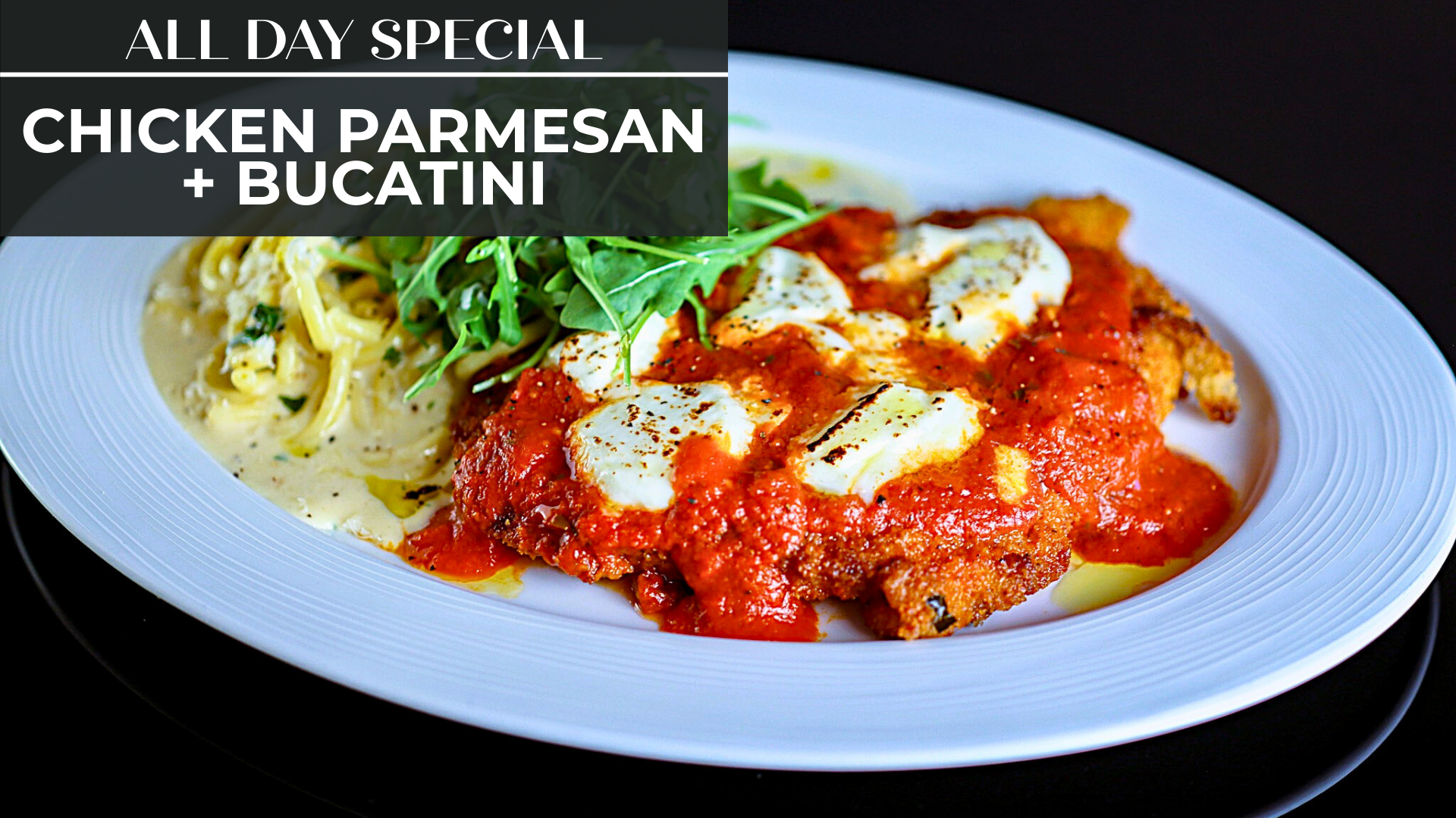 Herb + Panko Breaded • Pan Fried • Mozzarella • Pomodoro • Fresh Bucatini + Parmesan Cream • Basil • Arugula • EVOO