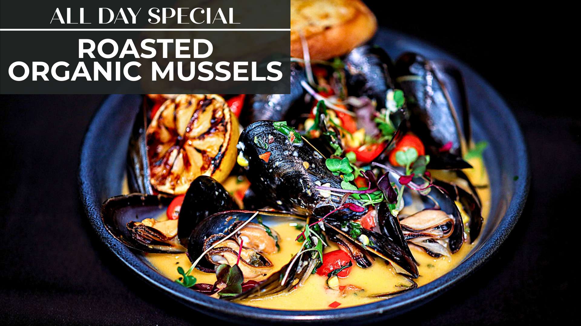 Black Bear Bay Newfoundland • Grilled Corn • Tomatoes • Green Onions • Parmesan Cream • Chile Flakes • White Wine • Grilled Lemon • Rustic Garlic Toast
